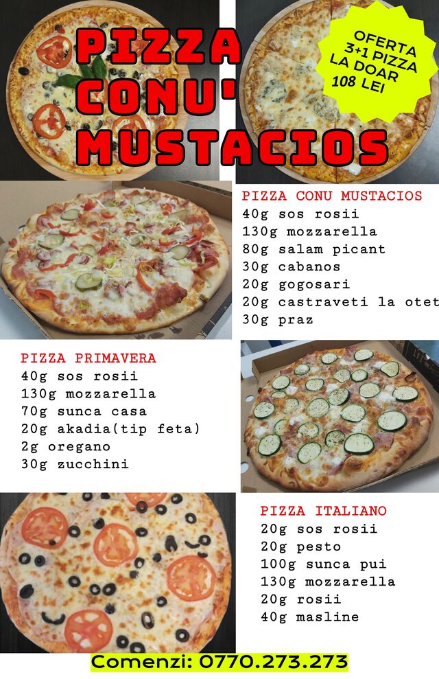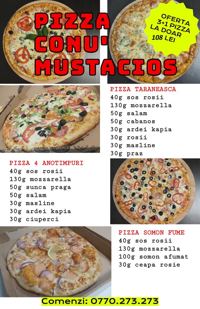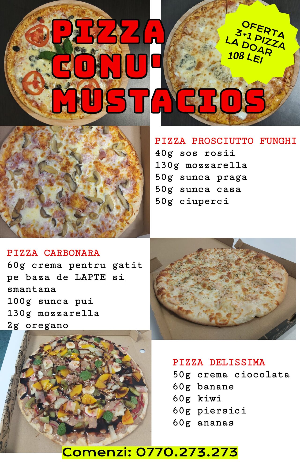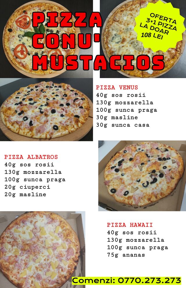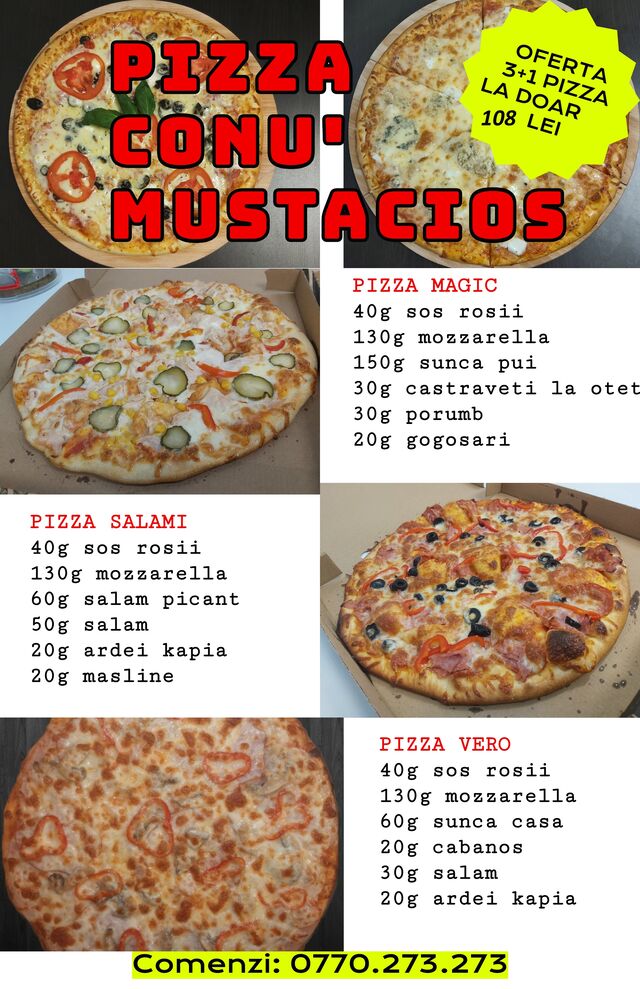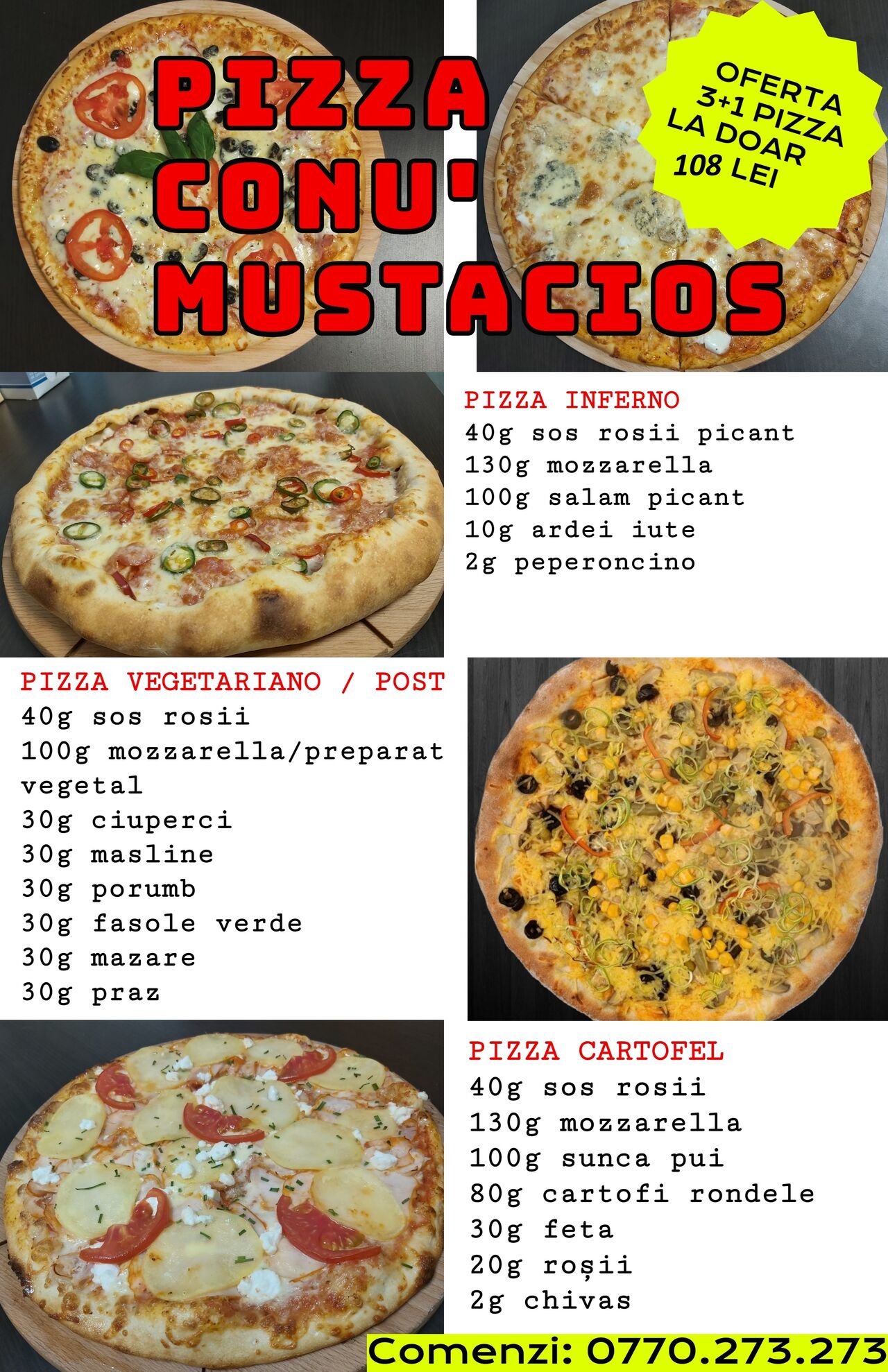 Dacă plănuiți o pauză de masă la prânz în care să vă bucurați de o mâncare delicioasă, atunci ar fi indicat să treceți pe la „Conu' Mustacios”. Fie la munca in pauza de masa, fie acasa cand nu mai stii ce sa gatesti, te asteptam cu o varietate larga de sortimente de pizza. In plus, iti oferim si posibilitatea de a iti face pizza dupa propriul plac prin adaptarea retetelor standard.