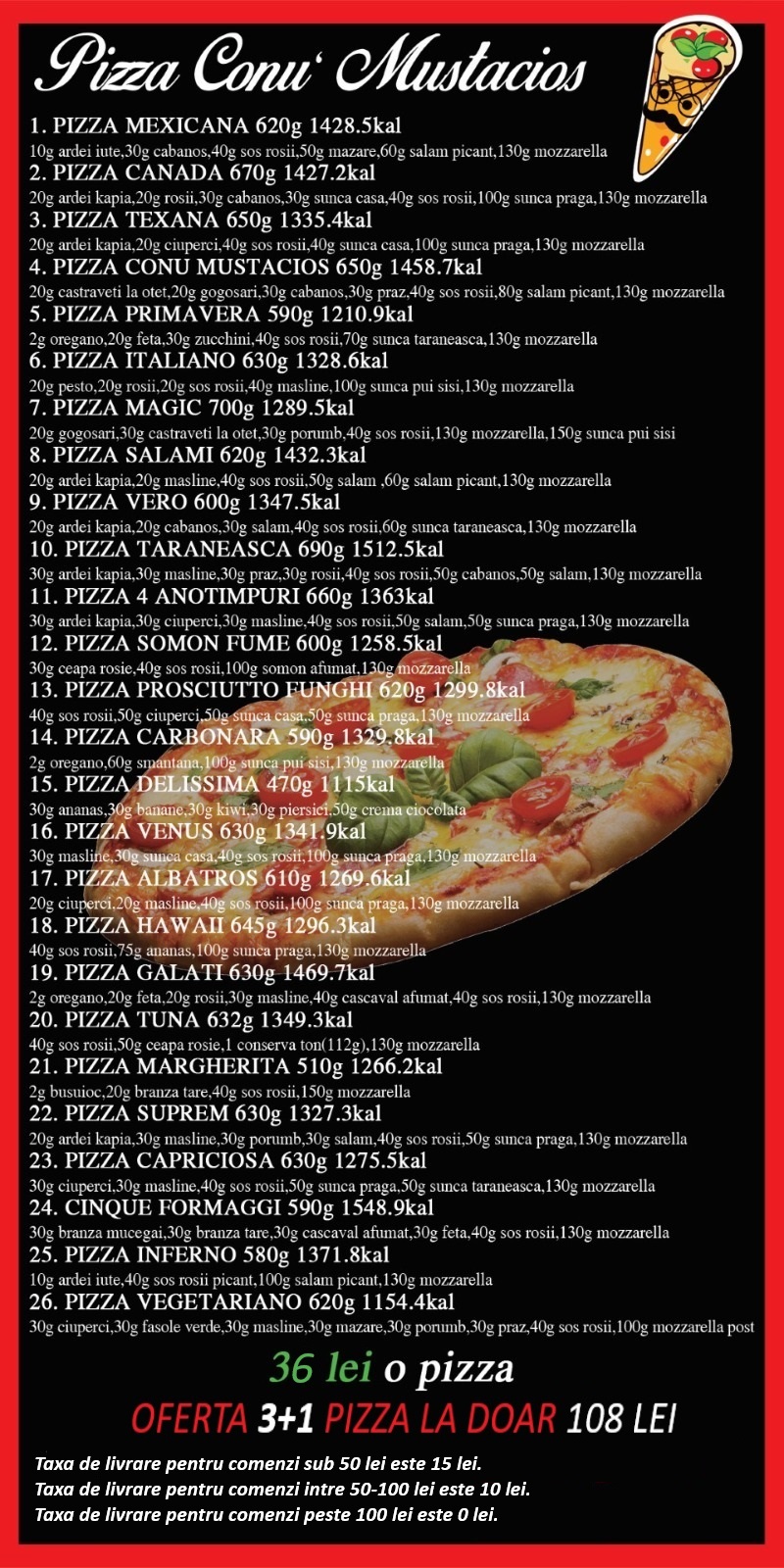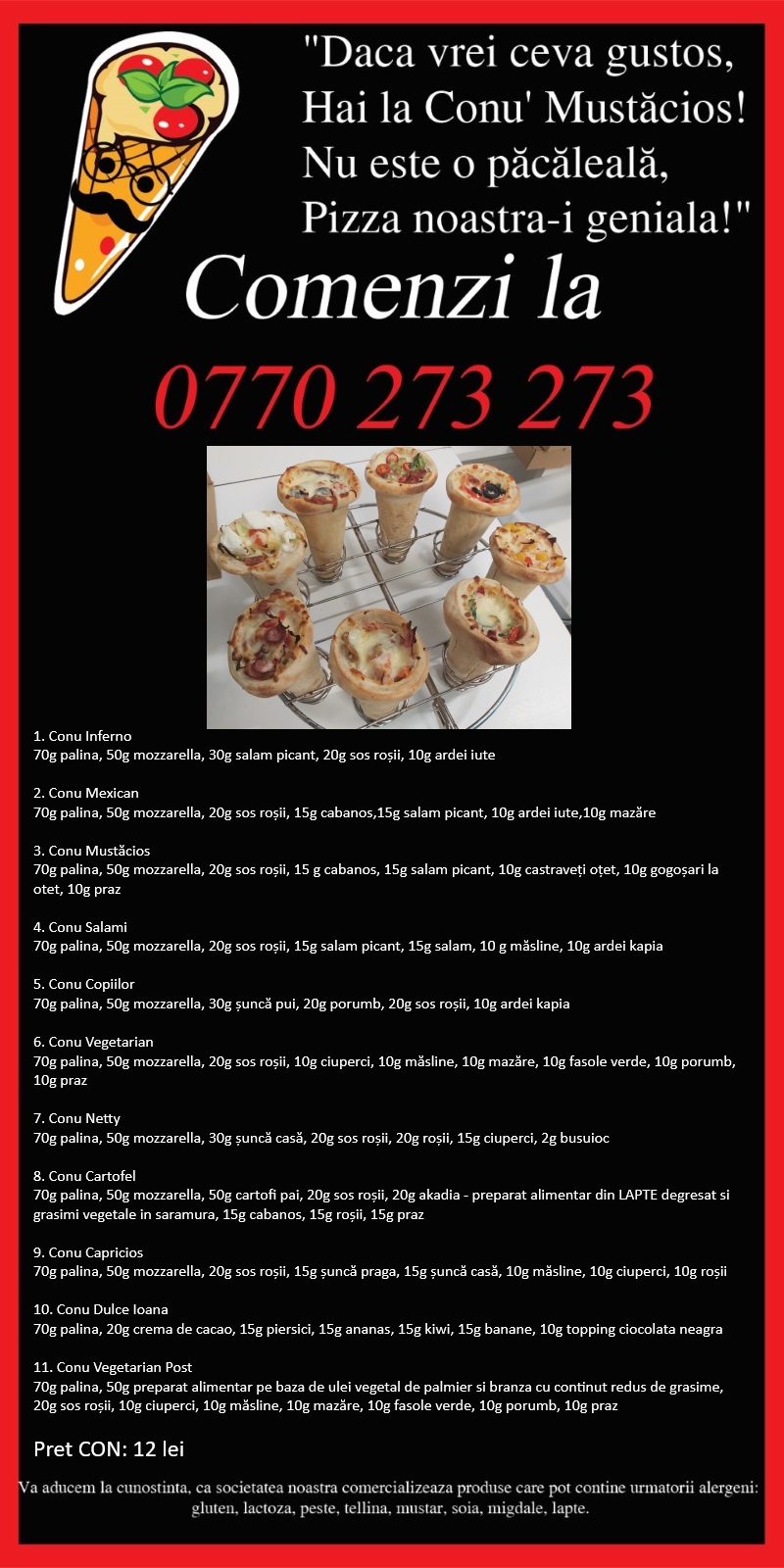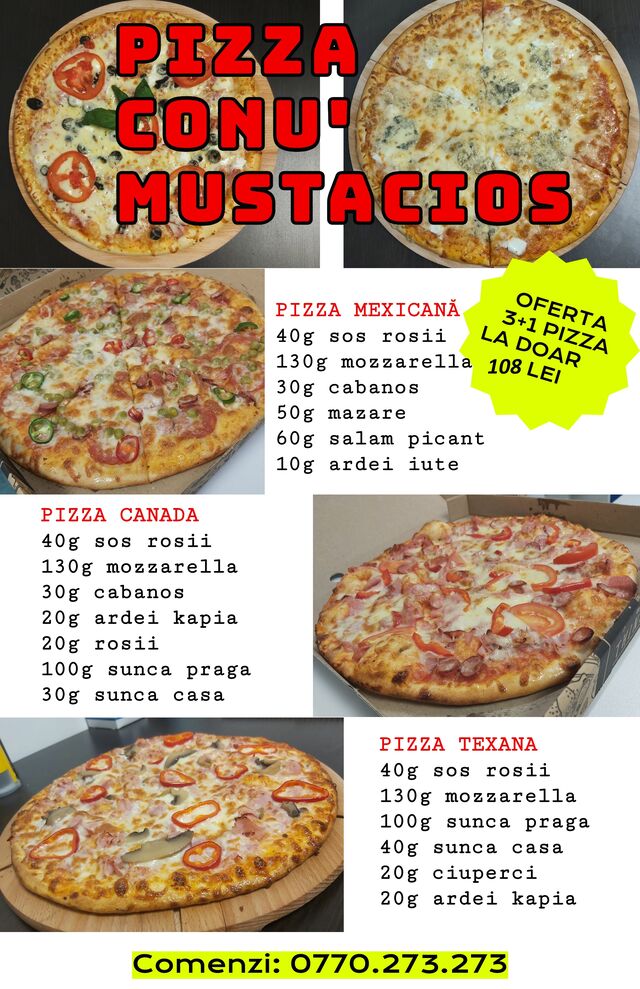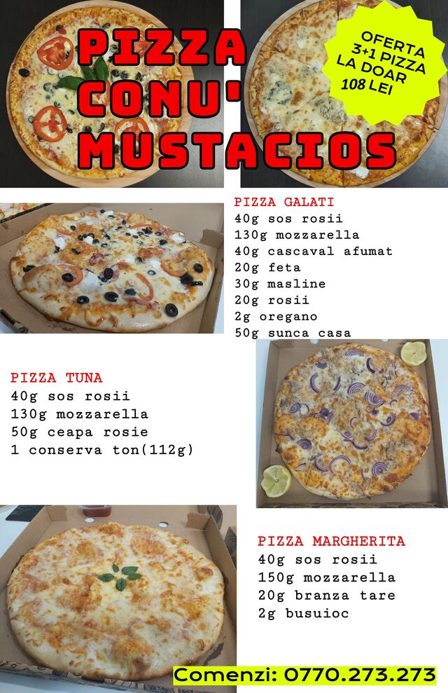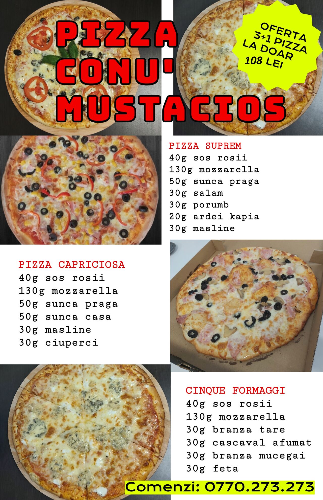 Dacă plănuiți o pauză de masă la prânz în care să vă bucurați de o mâncare delicioasă, atunci ar fi indicat să treceți pe la „Conu' Mustacios”. Fie la munca in pauza de masa, fie acasa cand nu mai stii ce sa gatesti, te asteptam cu o varietate larga de sortimente de pizza. In plus, iti oferim si posibilitatea de a iti face pizza dupa propriul plac prin adaptarea retetelor standard.